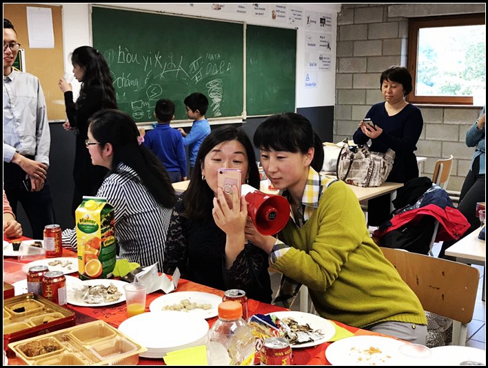 2017年9月30日放学后,列日中文学校的老师们,举行了一个小型的茶话会,喜迎国庆中秋,周玲荣董事长也特地赶来和老师们共庆佳节。 老师们喝茶聊天,交流工作中的心得体会。交流之余,我校多才多艺的老师们还表演了朗诵,歌曲等精彩的节目。